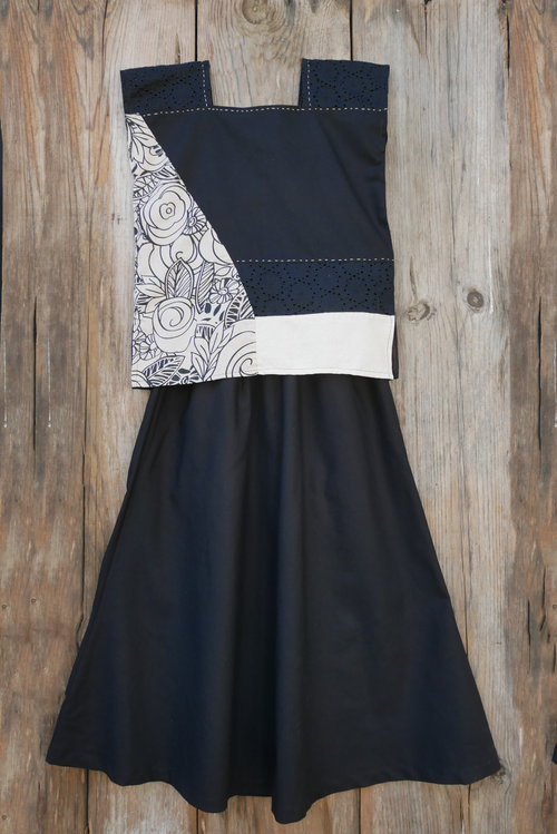 Vestido corto de lino negro con seda verde olivo. -